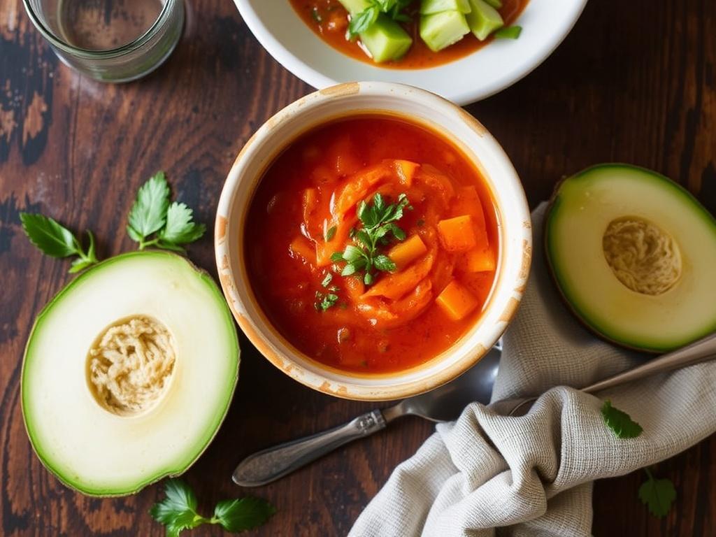 Без хлеба встречается всё чаще. В варианте «гаспачо без хлеба» масса становится легче и чаще ориентируется на яркость помидоров и зелени. В такие версии можно включать авокадо, лимонную цедру или лёгкую специю, чтобы сохранить кремовую текстуру без связующего элемента. Это отличный способ попробовать что-то новое, не отказываясь от любимого напитка лета.
