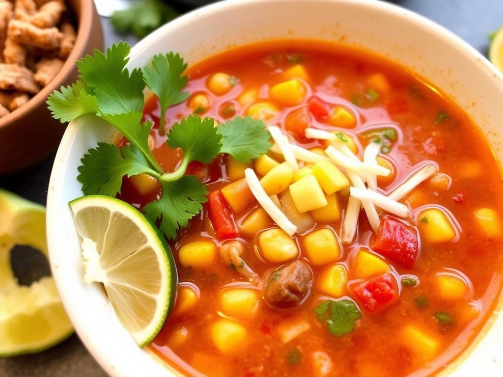 - Финал и подача: проверьте соль и кислинку, при необходимости добавьте лайм и зелень. Подавайте с ломтиками авокадо, нарезанной капустой, луком и горячими тортильями. Горячий суп любит, когда рядом есть хрустящая лепёшка и прохладный напиток.