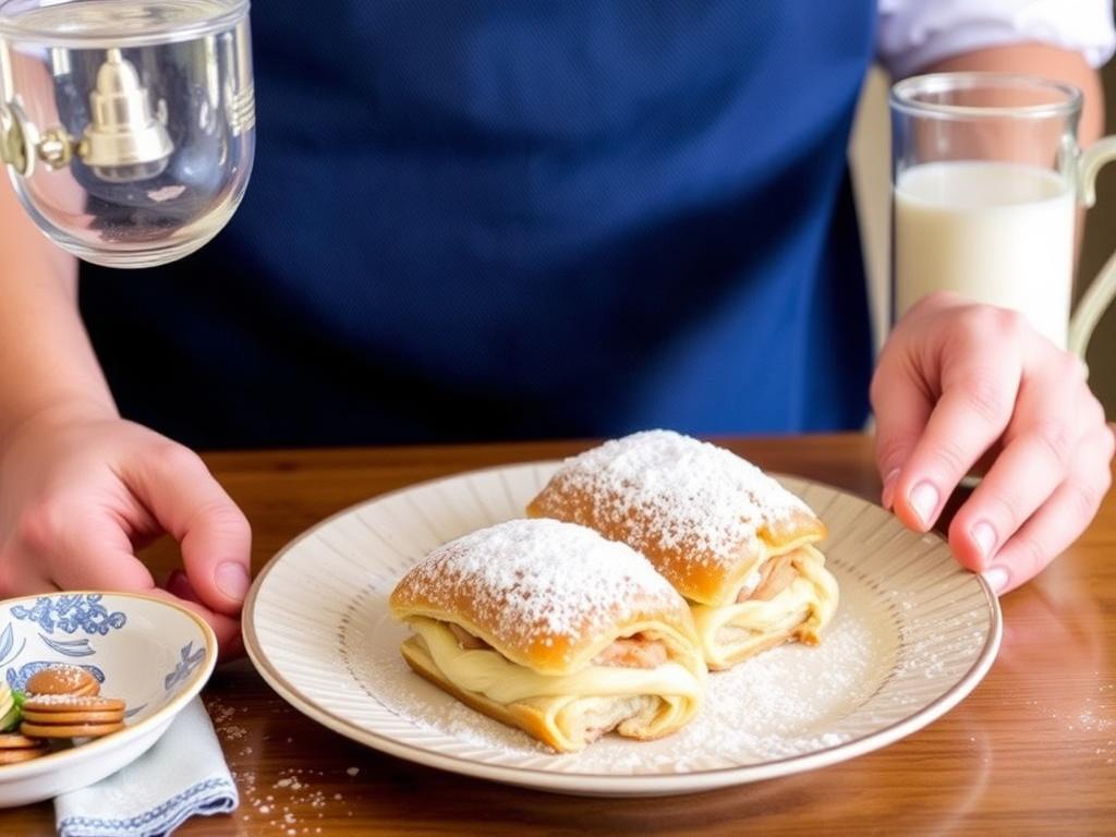 Удачная подача требует внимания к деталям. Пудра имеет право прилепиться к поверхности, но не превращать десерт в грязную кашу. Небольшой слой сливок или шарик ванильного мороженого — классика, которая работает почти безукоризненно. А если хотите оригинальности — подайте штрудель с небольшим количеством карамелизированной цедры апельсина, которая внесёт свежую нотку без перегруза сладостью.